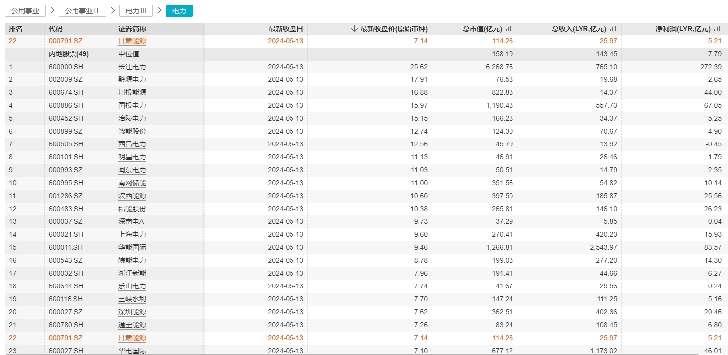 5月13日,A股电力板块高开。Wind数据显示,截至5月13日收盘,电力板块整体上涨1.31%。其中,甘肃能源(000791.SZ)、明星电力(600101.SH)、西昌电力(600505.SH)、乐山电力(600644.SH)收盘涨停,华电B股(900937.SZ)、赣能股份(000899.SZ)、南网储能(600995.SH)等涨幅居前。