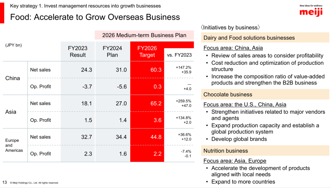小食代留意到,进入2024财年,明治正式开启了2026中期业务计划(2024-2026财年)。针对食品业务,该公司提出将加速海外业务增长,而中国市场的复兴成为当中重点。
