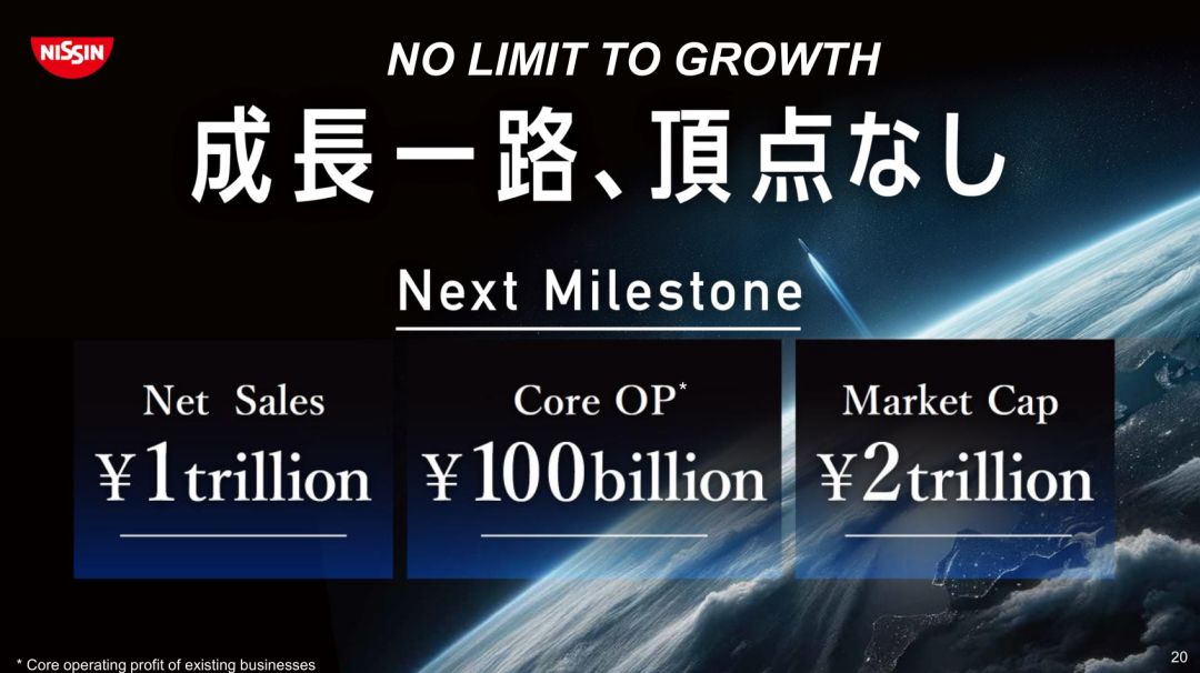 “我们的下一个里程碑是,净销售额达到1万亿日元,核心经营溢利达到1000亿日元,市值达到2万亿日元。”日清在业绩资料中提出。