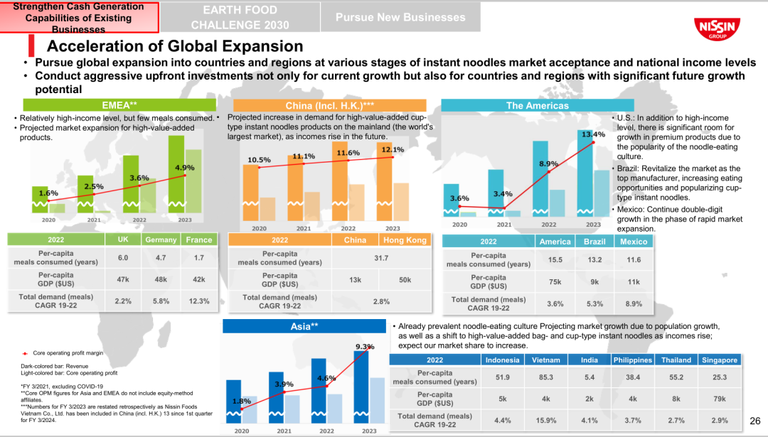 在列出“主要增长驱动力”时,中国在其海外业务中被圈定为关键市场之一。“在中国市场,我们要推动支柱品牌合味道的发展,同时推动高附加值袋装方便面收入增长。”日清表示。