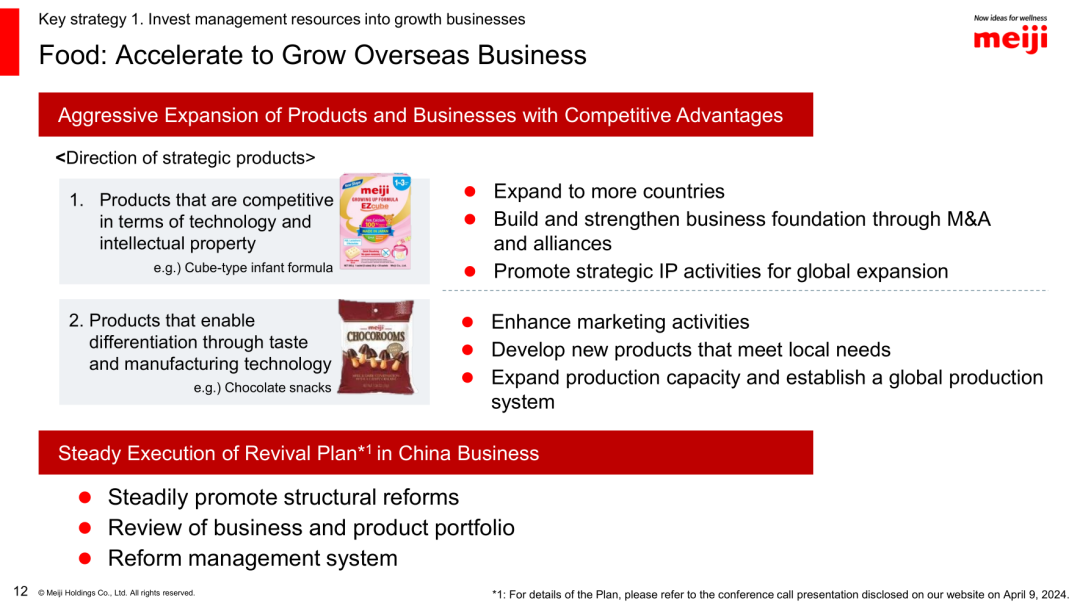 该计划主要有两大关键举措,一是,积极拓展具有竞争优势的产品和业务。明治提到了两大产品方向,包括具有技术和知识产权竞争力的产品(诸如方块状婴儿配方奶粉等),以及通过口味和制造技术实现差异化的产品(巧克力零食等)。