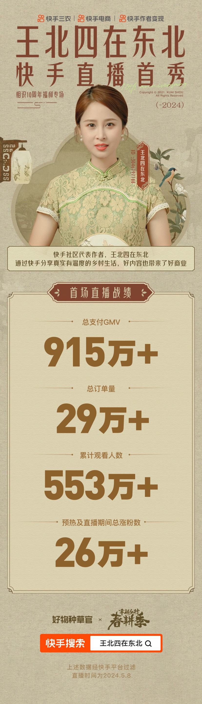 这个成绩让王北四感到惊喜,也让她从此开始了直播带货的新事业。5月8日中午12点,@王北四在东北 在快手开启“相识10周年福利专场”直播,13小时的直播累计吸引了超过553万老铁在线观看,预热及直播期间总涨粉数达到26万,专场累计订单量达超过29万,累计GMV超过915万。其中,伊春黑木耳等助农产品累计GMV达60多万。