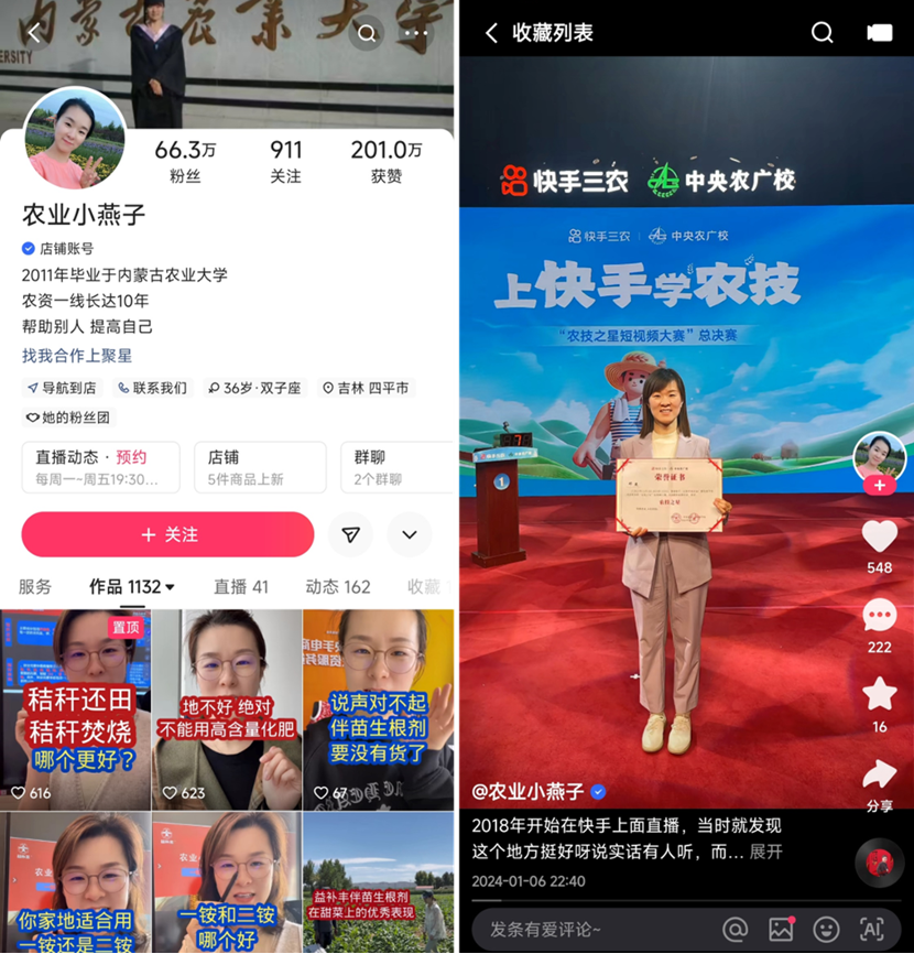 由女白领转型为“新农人”的快手主播@农业小燕子 把多年积累的农业知识带到线上,粉丝按照她的短视频内容做,农作物长得好、收成高,一传十十传百,账号很快突破万粉。她还通过直播向粉丝分享高性价比的农资,逐渐成为三农领域颇具影响力的个人IP,每场直播能影响数以万计的普通农民。2021年,快手正式开通农资类目后,她又果断开通快手小店,随后创立属于自己的农资品牌,大大地缩短了农资交易链路。目前,邓燕的快手小店已经售出超过19万份农资产品,她不仅为全国各地农民提供了物美价廉的农资产品,也实现自身收入的几何级增长。