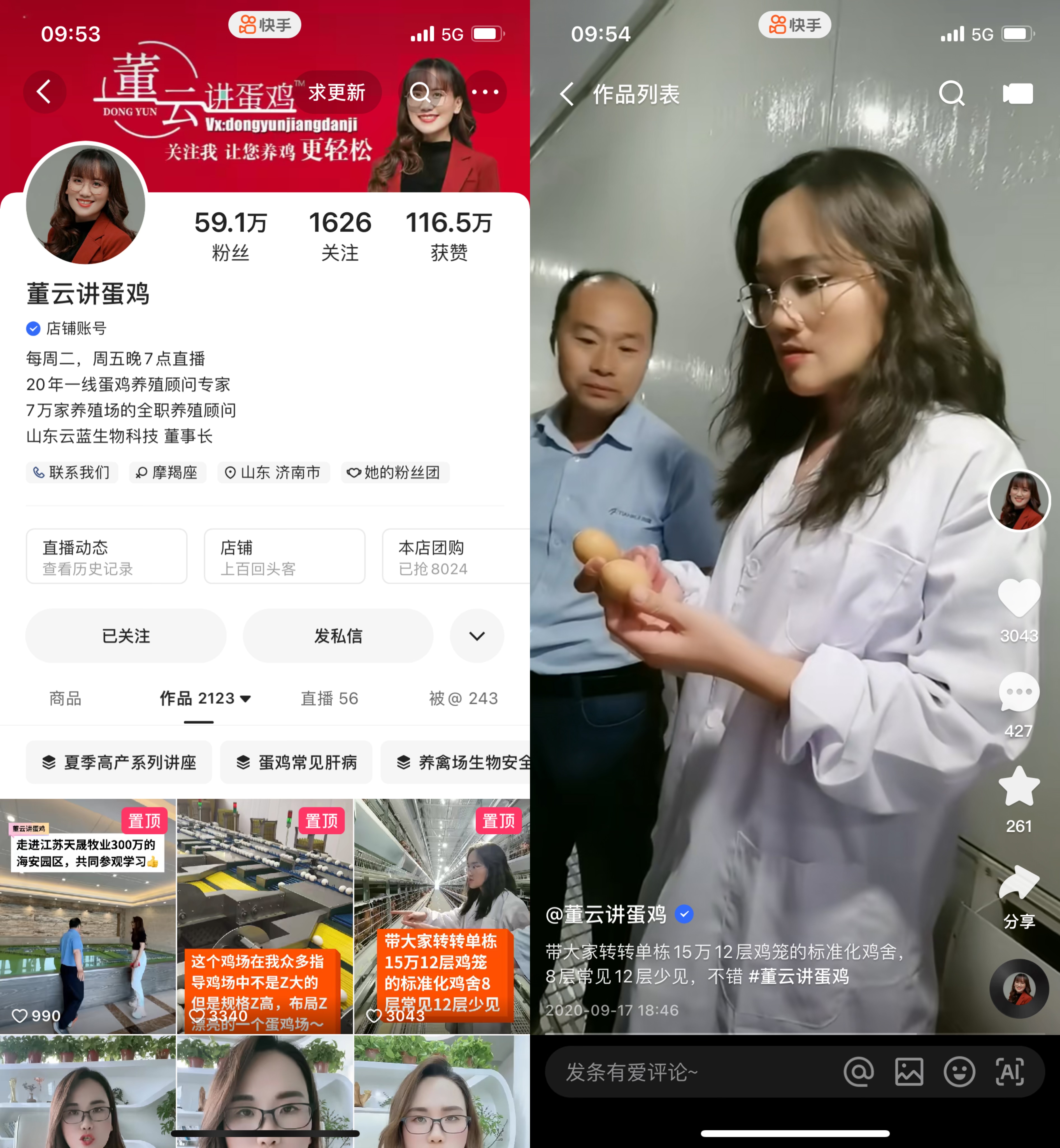 另一名快手主播@董云讲蛋鸡 在蛋鸡禽病诊疗和饲养管理领域深耕了20年,在养殖门类中属于小众专业。一次偶然的机会,她把自己掌握的蛋鸡养殖知识在快手上分享,发到十几条视频时,突然播放量猛增。全国各地的网友通过她的短视频学习到了很多养殖知识,很多人也开始来找她咨询问诊以及购买药品,她在快手的第一个月销售额就达到26万,销售额随后逐月倍增。依靠在快手的粉丝积累,董云成立农资公司,目前企业全年流水突破亿元,她的内容同时让全国很多养殖户受益。
