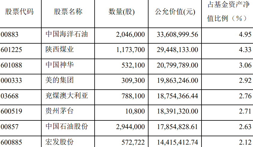 看看最新持仓,都是耳熟能详的大型股票,而且是上游资源类股票,虽然在过去一个季度产生了较好收益贡献,但子行业的过度集中也蕴含着些许风险。