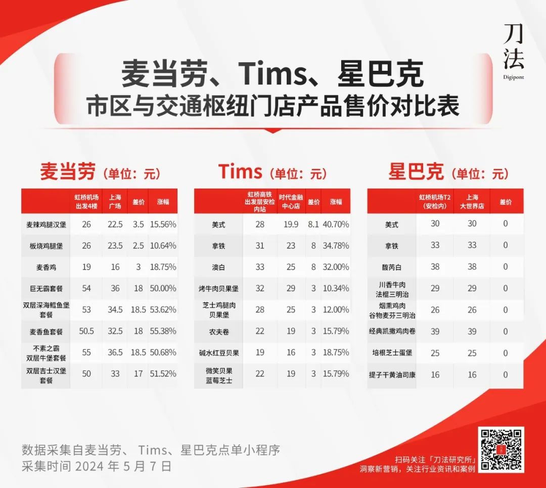 举例来说,就上海虹桥和市区麦当劳、星巴克、Tims 三家定价作对比来看,虹桥机场麦当劳门店的汉堡单品较市区门店涨幅在 10%-20%,套餐在 50% 左右;Tims 咖啡饮品系列涨幅在 30%-40%,热食在 10%-20%,主要是由于市区门店饮品有官方折扣优惠;而星巴克虹桥机场 T2 门店与大世界门店的价格表完全一致。