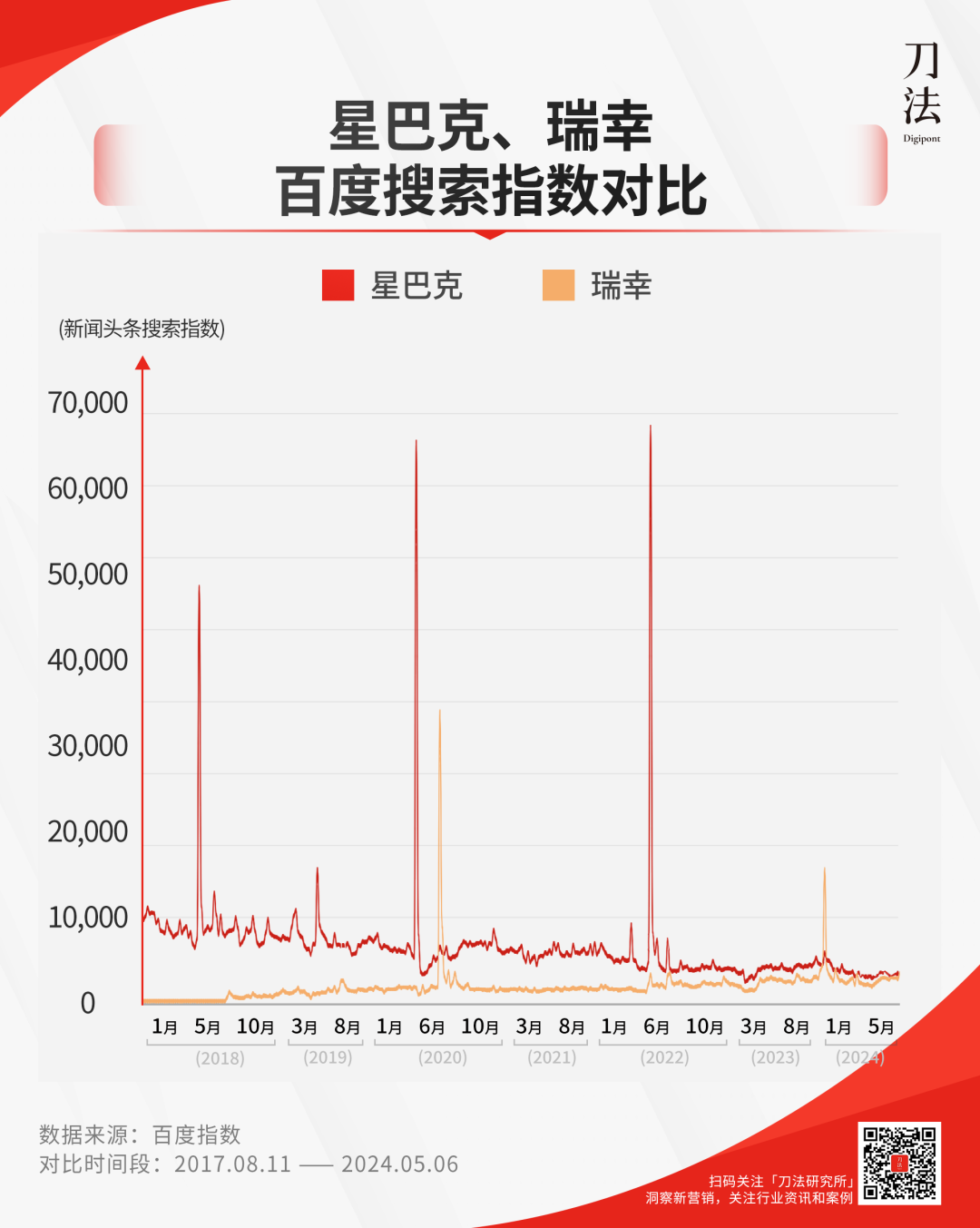显然不是。就百度指数显示,星巴克的关联词热度 TOP1 就是瑞幸咖啡。而且拉长时间轴来看,星巴克的百度指数是呈现下滑趋势,而瑞幸是缓慢上升。