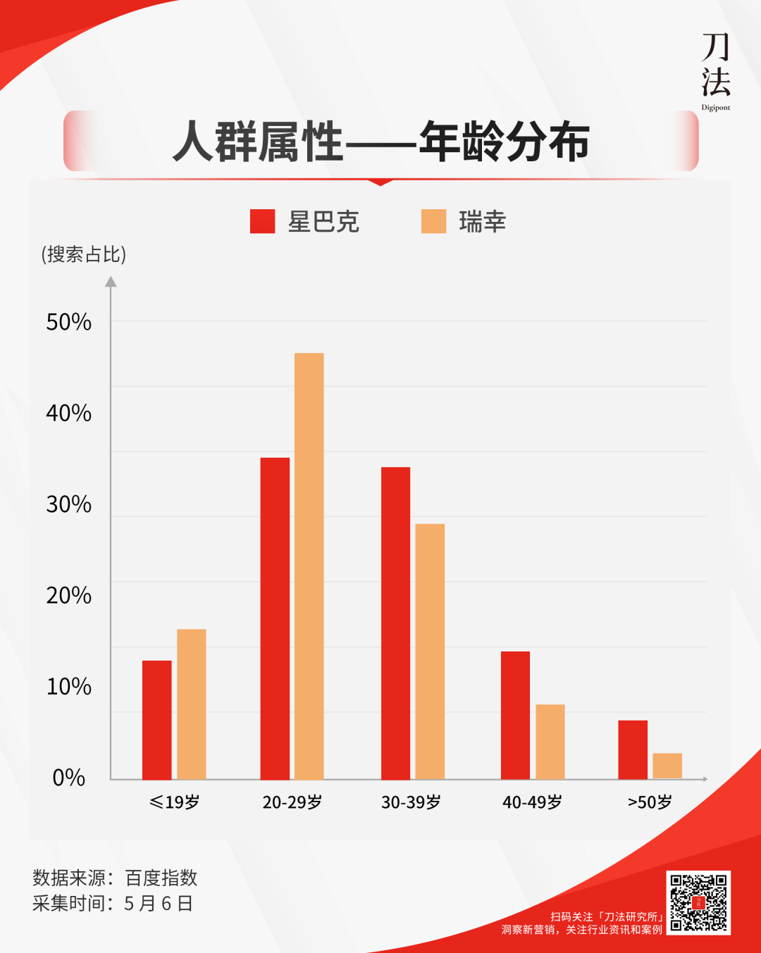 这一点在星巴克和瑞幸百度搜索指数上也有所体现。对比星巴克和瑞幸的人群分布,会明显看到 30 岁,是两者的一道坎。对于没有与星巴克共同成长的年轻人来说,这个品牌于他们并无特殊之处。