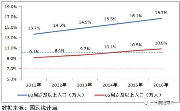 2016年,我国60岁及以上人口占总人口16.7%,65岁及以上占10.8%,远超国际公认的老龄化社会标准。而中国育龄妇女的总和生育率仅为1.05,也预示着中国正在加速进入银发社会。