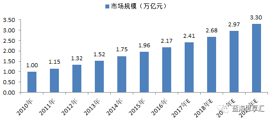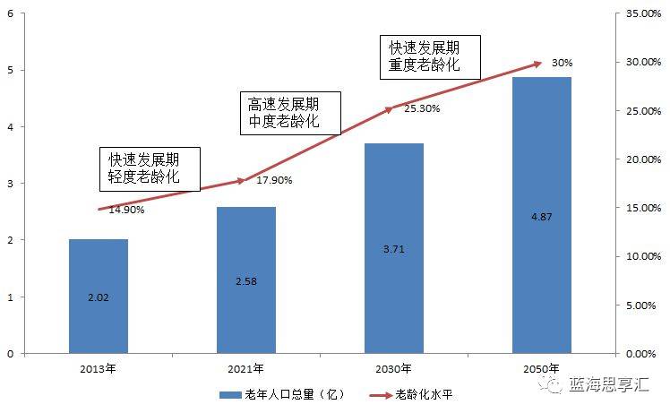 数据表明,在2015年,我国老年人口消费规模约2万亿元,我们预计此后仍将有相当长的时间维持两位数增长速度,并将在到2020年达到3.3万亿元,2030年达到接近10万亿元,我国将成为全球老龄产业市场规模最大的国家。