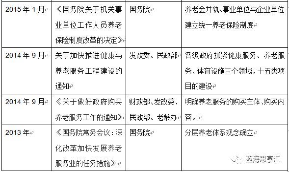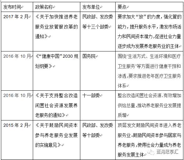 2015年2月,10部委联合发布《关于鼓励民间资本参与养老服务业发展的实施意见》,顶层发出鼓励民间资本参与养老产业发展的明确信号,并给出相关的优惠政策保障。