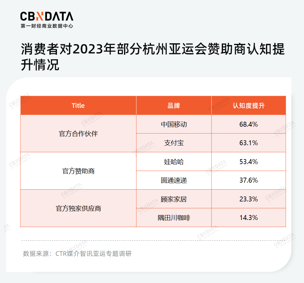 随着政策对体育赛事的持续加码以及全民健身热潮的不断升温,体育营销的商业价值更加凸显,能够为品牌带来足够高的回报。据权威调查公司(ISL)测算,相较于常规广告,同等投入下体育赞助的回报率可高达三倍之多[1]。尤其在品牌的形象树立和影响力扩圈方面更是立竿见影。央视市场研究(CTR)数据显示,经历了亚运会,消费者对各级赞助商的认知有普遍提升。
