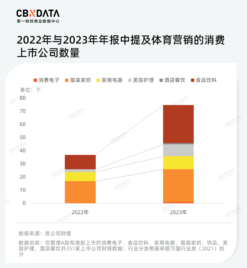 因此,2023年赛事复苏使得品牌重新聚焦体育营销,并且表现出支持热情不减。这点在许多品牌的去年年报得到明显体现。CBNData不完全统计,2023年超2成企业在其年报中提及体育营销。与2022年相比,提及体育营销的消费企业数量实现了翻倍增长。特别是在食品饮料和美容护理行业,提及企业的数量有了显著增加。