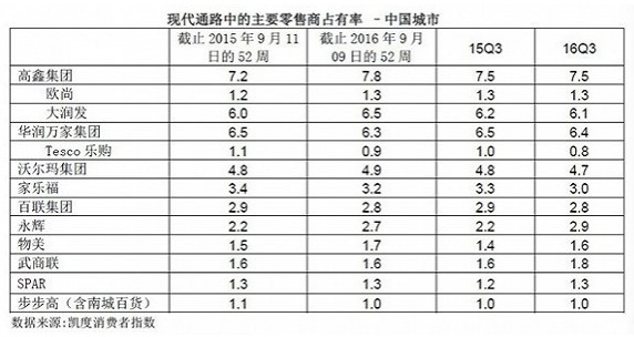 根据凯度消费指数发布的主要零售商市场份额占有率,在去年第三季度,大润发、华润万家、沃尔玛、家乐福、百联等零售巨头的市占率全部处于下滑状态。