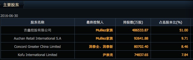 公开资料显示,高鑫零售的股东为4个,分别为吉鑫控股(51%)、欧尚零售(9.71%)、润泰集团(8.46%)、个人持股的尹崇尧(7.84%)。其中吉鑫控股股权结构是欧尚占51%,润泰占49%。算上润泰集团总裁尹衍梁之子尹崇尧的润泰系股份,润泰系持有大约60%股权,是高鑫零售的控股方。