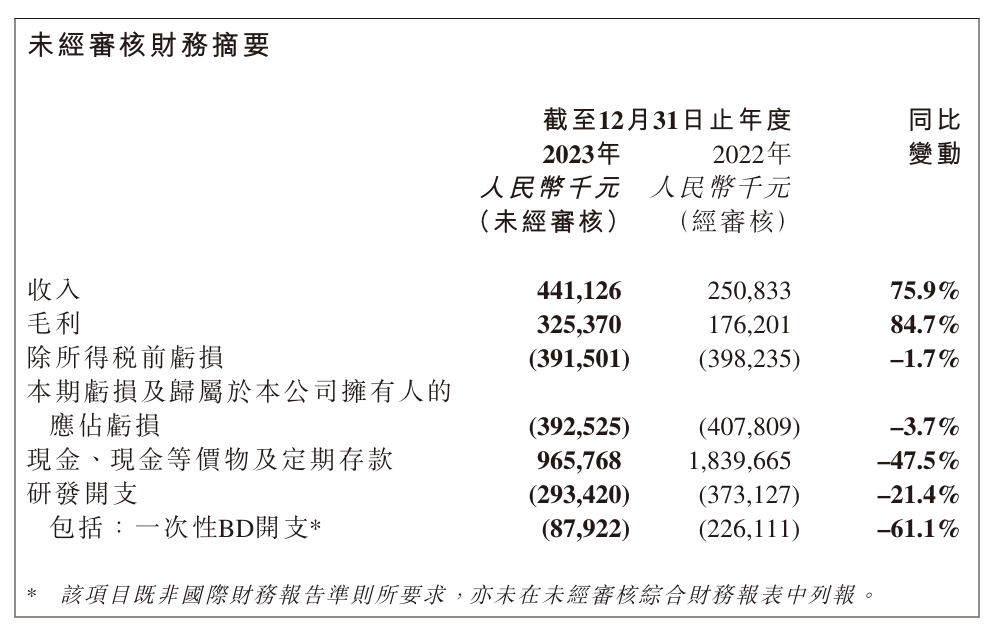 沛嘉医疗在停牌之前发布的“未经审核年度业绩公告”显示,其2023年实现营业收入4.41亿元,同比+75.9%;实现毛利3.25亿元,同比+84.7%;税前亏损幅度缩小,从3.98亿元减少至3.91亿元,同比-1.7%。