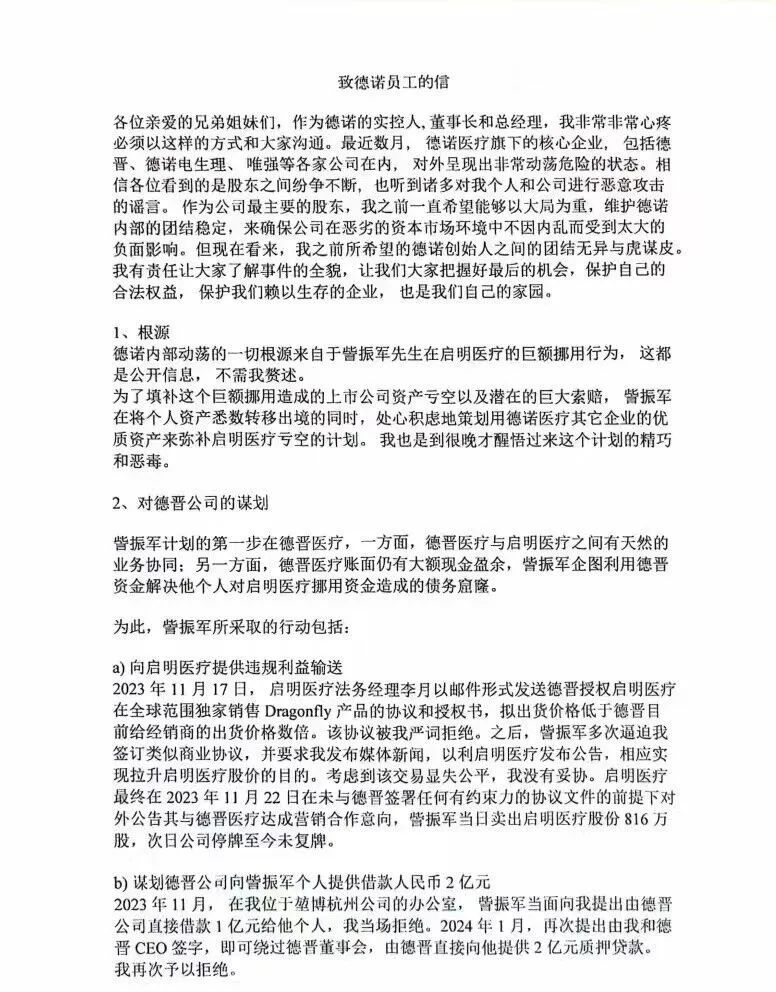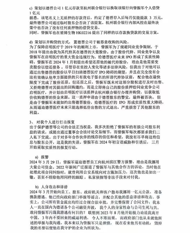 不过,5月11日,据界面新闻消息,其获悉一份对于港股上市公司启明医疗创始人訾振军的控诉书(附于文末)。其中,投资孵化了启明医疗的德诺医疗实控人、董事长赵亦伟直指创始合伙人訾振军谋划同系企业德晋医疗,以填补其挪用启明医疗巨额资金产生的漏洞。据控诉书,赵亦伟表示,訾振军谋划绕过德晋医疗董事会向訾振军个人提供2亿元私人借款;策划以德晋医疗1亿存款至杭州联合银行换取该银行向訾振军私人贷款1亿元;质押持有的部分德晋医疗股份换取贷款使该公司陷入被恶意收购风险。