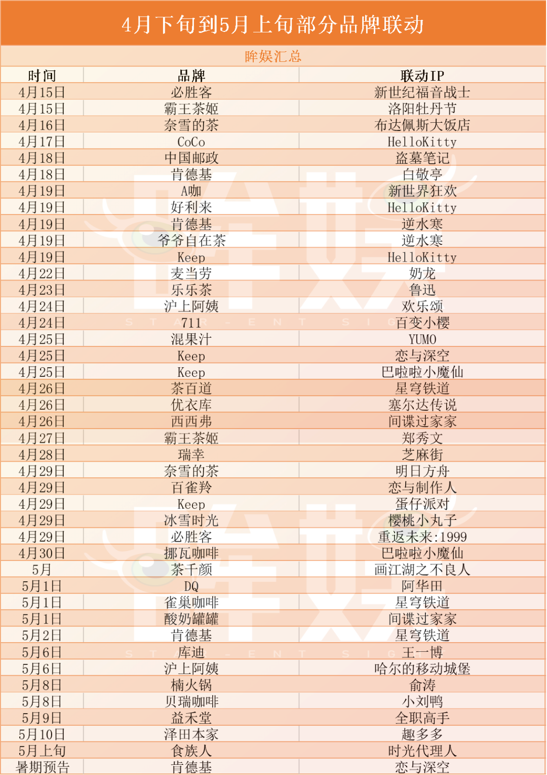 这种缺钱又要办事的窘态在联动的IP端也有所体现。目前联名的IP除Hello Kitty、樱桃小丸子这样的经典IP外,大部分品牌联动的文娱IP以影游两端的IP为主,更为昂贵的真人明星数量锐减,在4月15日到5月15日中仅有3起。