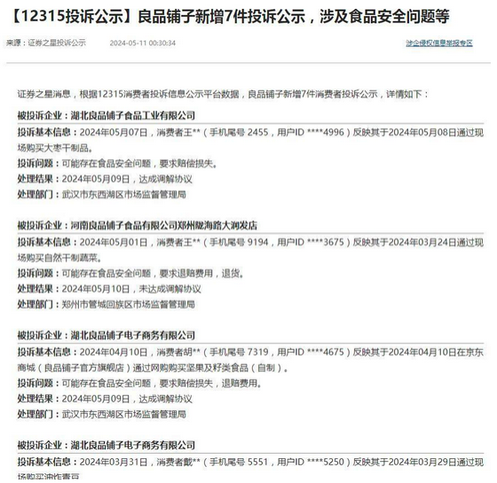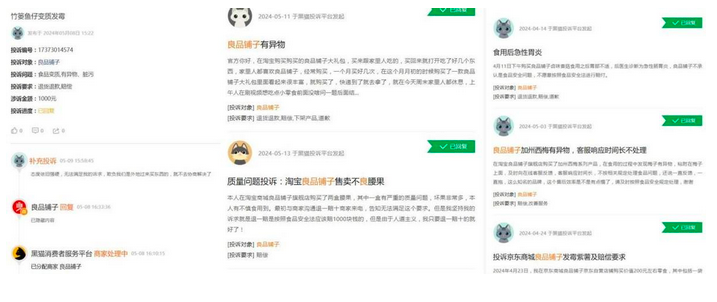 在12315投诉公示区,也能看到良品铺子新增7件投诉,涉及食品安全问题等的相关报道;