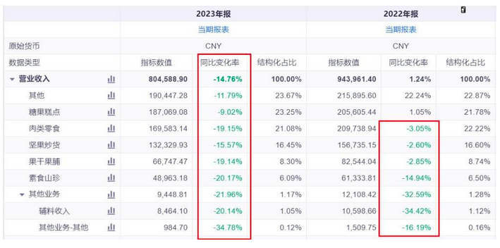 同理,作为一个主打高端零食的品牌,良品铺子的业绩下滑的深层次原因,也得归咎于产品的吸引力在下滑,从产品侧来看,良品铺子主打的粮果糕点、肉类零食、坚果炒货、果干果脯和素食山珍等产品皆出现了不同程度的下滑,当是最好的数据佐证。