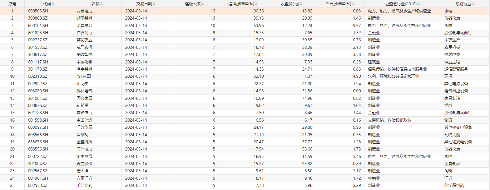 5月14日,Choice数据统计,A股今日2只个股连续13天上涨,分别是西昌电力、迦南智能;1只个股连续10天上涨,为明星电力;此外,沪农商行连续9天上涨;葵花药业连续8天上涨。