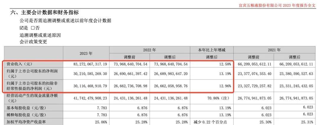 4月28日,五粮液正式发布2023年年报,顺利完成去年初制定的营业总收入力争实现两位数增长的目标。2023年全年,五粮液实现营业收入832.72亿元,同比增长12.58%;实现净利润302.11亿元,同比增长13.19%;扣非之后,五粮液净利润为301.16亿元,同比增长12.96%。