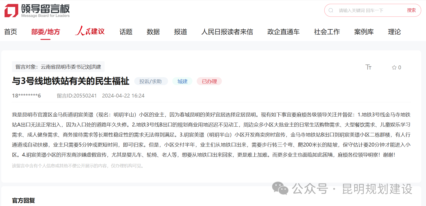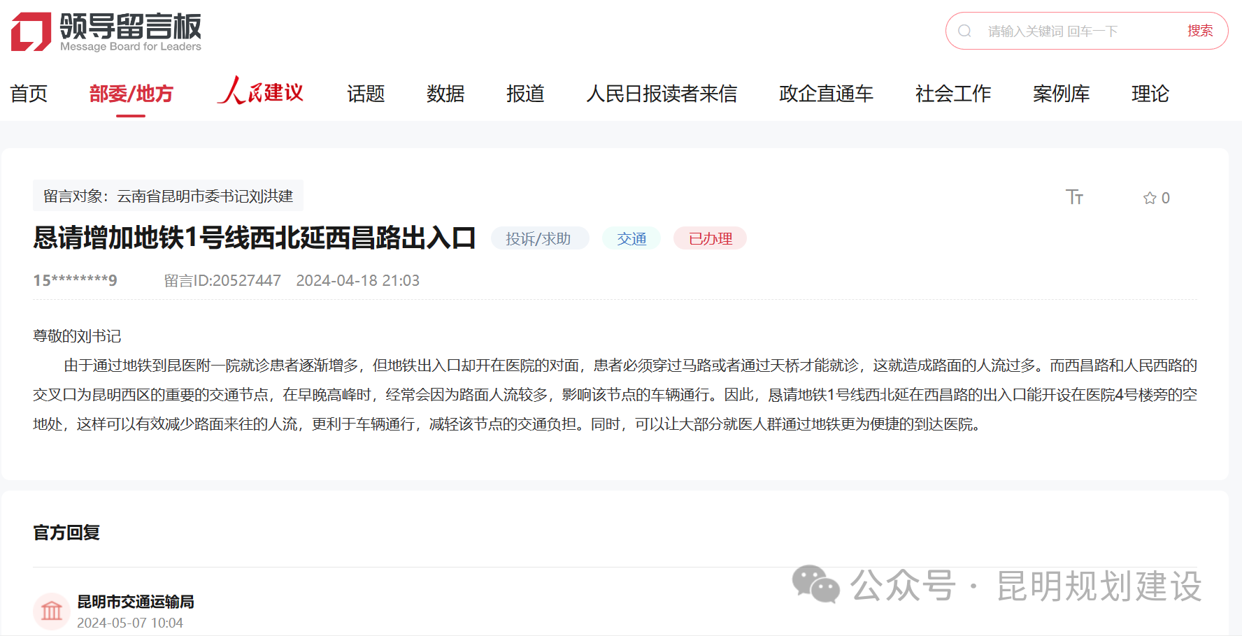 对于网友在人民网领导留言板上关于“明玥半山小区坐地铁问题”及“建议在西昌路新增地铁出入口”的留言,昆明市有关部门于近日分别进行了回复。