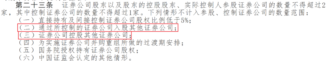 不过,根据《证券公司股权管理规定》(2021年03月18日)的规定,6种情形可以豁免一参一控的规定,即不计入参股、控制证券的数量范围。其中,就包括证券公司控股其他证券公司。