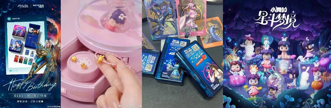 以《斗罗大陆》IP为例,除了和《迷你世界》《香肠派对》《永劫无间》等游戏作品频频进行内容联名之外,斗罗还与炫迈推出限定合作款口香糖礼盒;与周六福推出“小舞兔存金罐”礼盒;与屈臣氏推出“斗罗大陆动画X屈臣氏男士”联名颜值守护套装;与模联社合作推出《斗罗大陆-小舞的星斗梦境》系列盲盒手办……可以说是国漫跨界“顶流”之一。