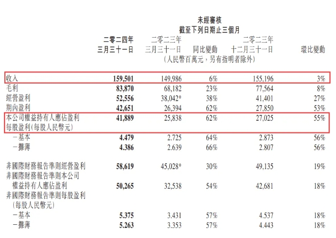 2024年第一季度,腾讯实现营收为1595.01亿元,同比增长6%,净利润为418.89亿元,同比增长55%。
