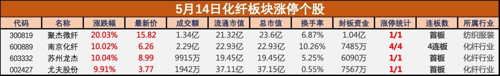 5月15日,化纤板块震荡拉升,南京化纤(600889)4连板,聚杰微纤(300819)、苏州龙杰(603332)、尤夫股份(002427)涨停,蒙泰高新 (300876)、华峰超纤 (300180)、汇隆新材(301057)等涨幅靠前。