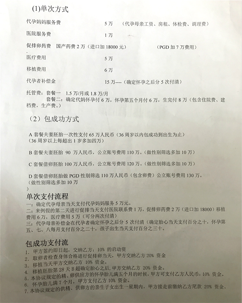 记者深入调查了解到,针对不同年龄层次的雇主,代孕机构提供的套餐大概分为三类:针对年轻夫妻的基础套餐,只包胚胎移植和代孕,不包成功,价格在35万元至45万元之间;进阶“包成功”套餐则需支付65万元至80万元,这意味着由客户承担的试管婴儿成功率、代孕生产风险转移到代孕机构;豪华套餐则包胎儿性别精准,价格在90万元到110万元之间。