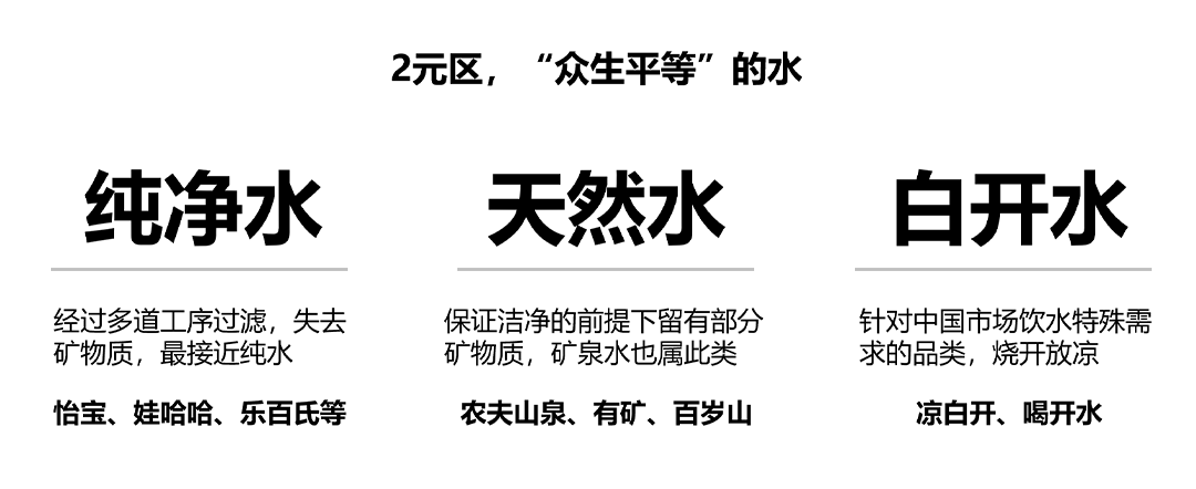 纯净水、天然水和根据中国人喝水特点打造的凉白开三种品类已经把饮用水的心智空间塞得满满当当。