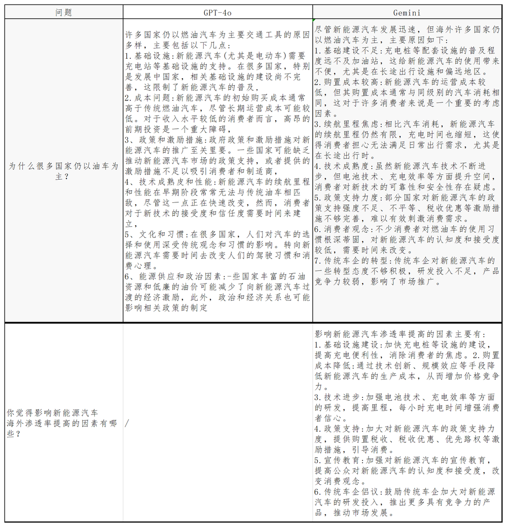 为什么很多国家仍以油车为主?你觉得影响新能源汽车海外渗透率提高的因素有哪些?我们将这一问题同时给到GPT-4o和Gemini,二者均指出充电基础设施建设、购置成本、技术进步、政策支持、消费者文化习惯是很多国家仍以燃油车为主的原因。