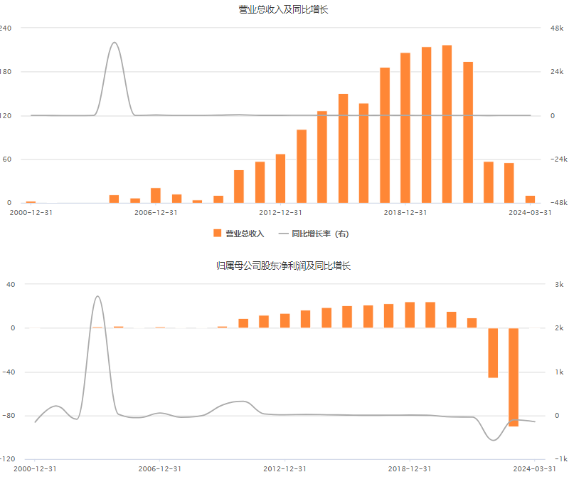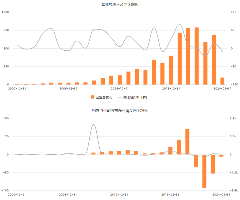2022年、2023年,该公司分别亏损45.31亿元、亏损89.96亿元,两年累计亏损超135亿元。2024年一季度,该公司继续亏损6447.15万元。
