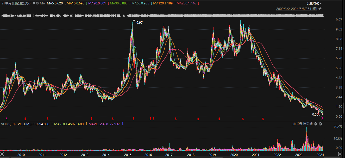 ST中南更早一步锁定退市命运。该公司5月13日收到深交所下发的终止上市事先告知书。该公司股票在2024年4月3日至2024年5月8日期间连续20个交易日的收盘价均低于1元,触及股票终止上市情形。