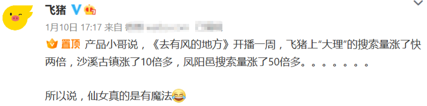 根据去年一月飞猪平台官方的统计,剧集开播一周后,“大理”的搜索量激增,凤阳邑的搜索量更是增长了50倍多。在去年年底大理州文化和旅游局也在专项活动中对该剧给予200万元补助,并积极开展以剧集为主题的宣传营销活动,旨在将“流量”转化为实在的旅游收入,同时提升完善取景点并开发新景点,为游客提供具有大理特色的旅游体验。