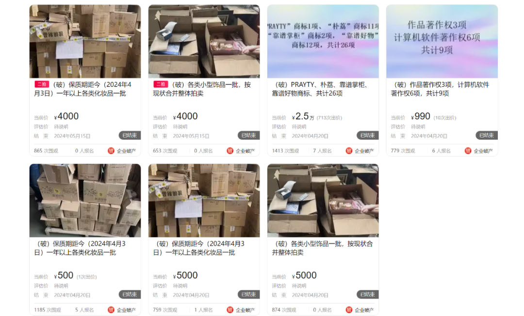 在阿里资产平台上,青眼注意到,今日上午10时,朴荔信息旗下的一批化妆品及一批各类小型饰品均因无人出价,而遭遇二次流拍。与此同时,4月20日,朴荔信息旗下的9项著作权、26项商标,以及一批包含C咖精华面膜、水之密语洗护套装等在内的化妆品被成功拍出,成交价分别为990元、2.5万元、500元。