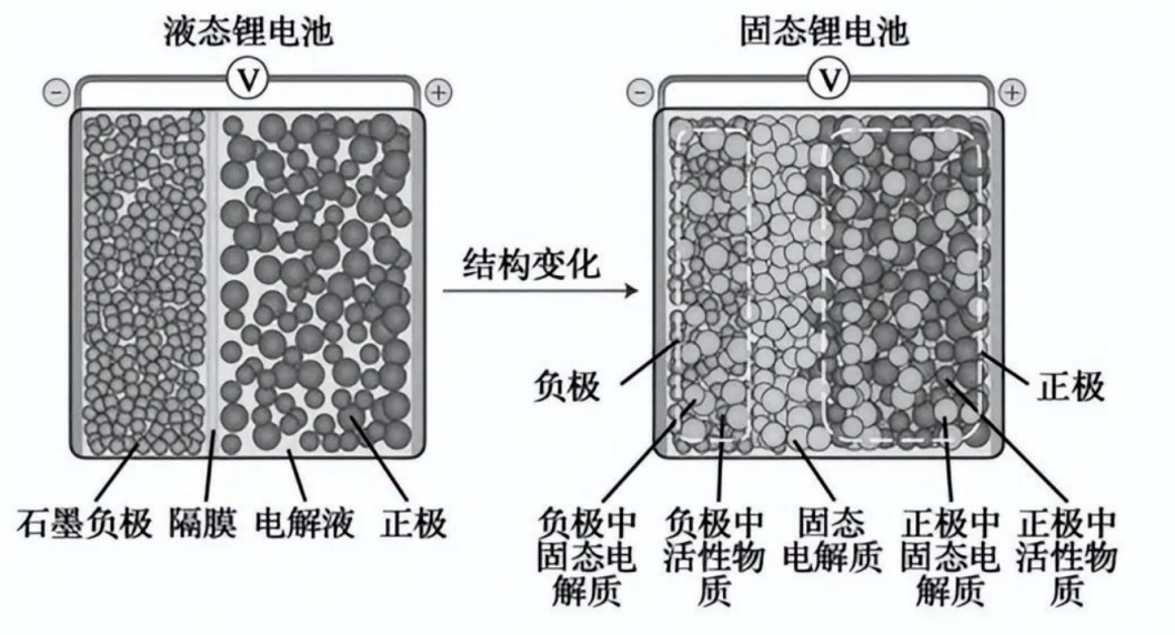 但固态电池也有着无可比拟的优点,下图是锂电池结构的变化,左边是液态电池,右边是固态电池。