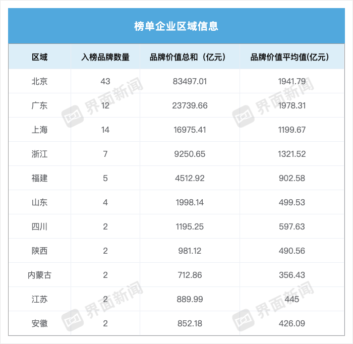 从入榜企业的地域分布来看,有16个省市自治区的品牌进入了百强品牌价值榜行列,其中,北京有43家,上海有14家,广东有12家,浙江有7家。