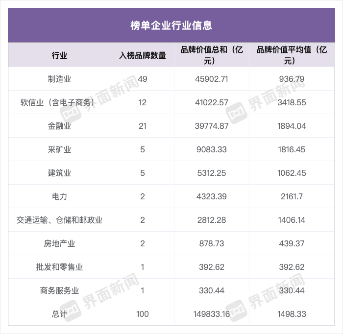 共有49家智能制造企业上榜,在入选品牌数量上遥遥领先,品牌价值总和45902.71亿元,占榜单总价值的30.63%,品牌价值总和位居各产业门类之首。
