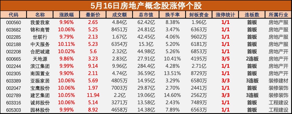 5月16日,房地产板块持续强势,我爱我家(000560)、南国置业(002305)、天地源(600665)、合肥城建(002208)、滨江集团(002244)等超10股涨停,南都物业(603506)、广宇集团(002133)、特发服务(300917)等跟涨。