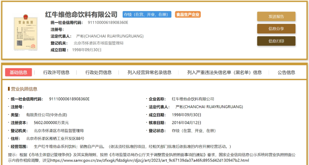 据天眼查,红牛公司的营业期限为1998年9月30日至2018年9月29日。不过,国家企业信用信息公示系统显示,红牛公司登记状态为存续(在营、开业、在册),核准日期为2016年4月12日。即,红牛公司已经顺利办理了延期。