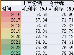 山西汾酒的毛利率,从2016年的68.68%,上升到2023年的75.31%,提高6.63%;同期,今世缘则从70.96%上升到78.34%,提高7.38%。