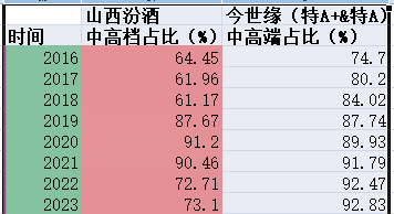 2020年,山西汾酒中高端占比达到91.2% ,此后有所下滑,这是因为其他系列酒放量导致。同样,近两年,今世缘特A类产品开始放量,也拉低了特A+ 的营收占比。