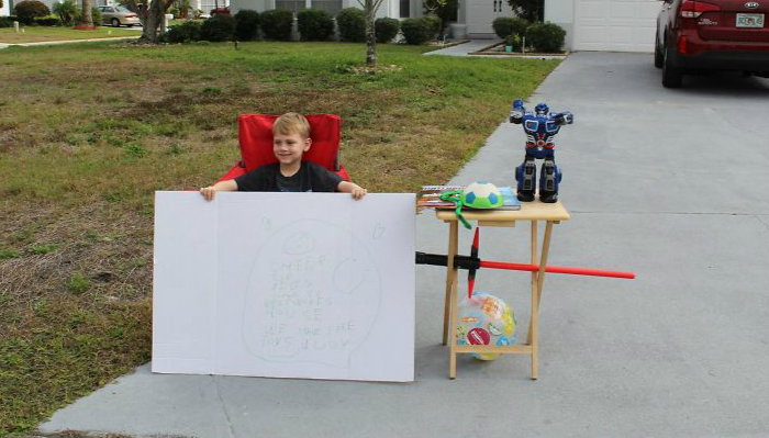 我6岁的儿子Blake想把他的玩具分给一些玩具没他多的孩子,他在我们的房子旁边设立了一个“免费玩具”摊。
