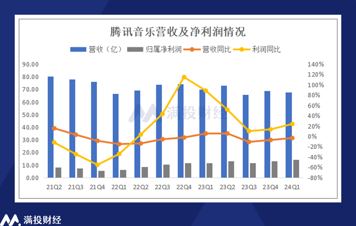 5月14日,腾讯音乐(1698.HK)发布2024年一季度业绩报告,总收入为人民币67.7亿元,相比2023年同期的人民币70.0亿元同比下降3.4%。Non-IFRS归属净利润为人民币17.04亿元,较去年同期的14.11亿元同比增长20.8%。