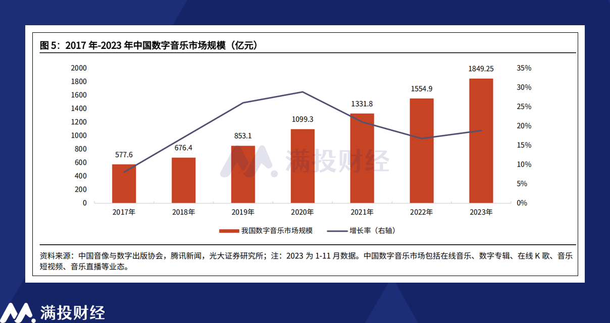 根据光大证券的研究,近三年来,受政策、疫情、供给侧等多重影响,游戏、电影等其他文娱行业市场规模呈现先跌后升趋势,而中国在线音乐市场规模始终维持稳步增长。2023年1-11月全国数字音乐市场规模达到1849.25亿元,同比增长18.9%。截至2023年6月,我国网络音乐用户规模达到7.3亿人,较2022年12月增长6.1%,音乐应用用户规模在整体网民中占比达到67.3%。
