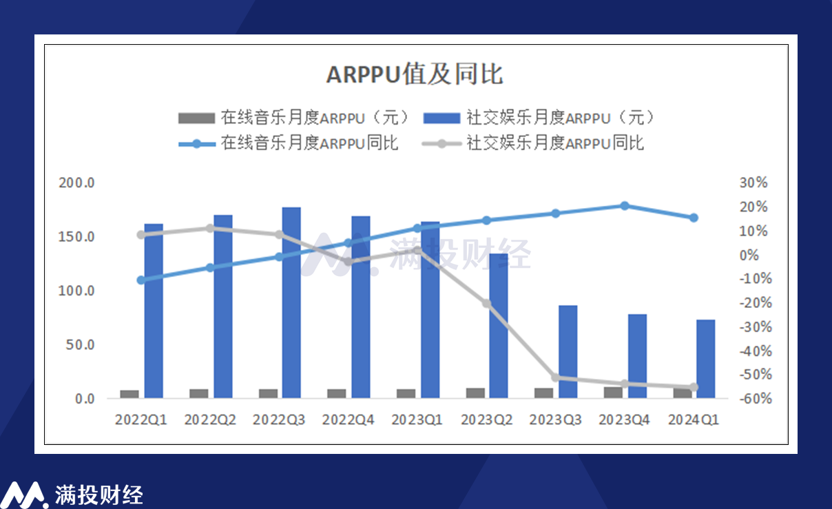 用户质量来看,2024Q1腾讯音乐在线音乐业务的ARPPU(单付费用户月均收入)为10.6元,同比增长15.2%,但增速较上季度有所下滑。社交娱乐的ARPPU值为73.4元,同比下降55.4%,环比下降5.90%,在经历大幅下滑后,社交娱乐的ARPPU值环比降幅有所缩窄。