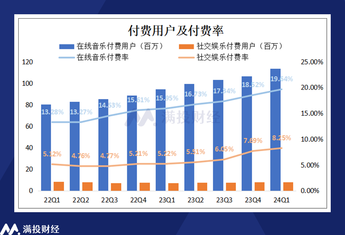2024Q1,腾讯音乐在线音乐业务的付费用户总数达到1.14亿人,同比增加了1910万人,付费率达到19.64%,同比增长3.69pct,在线音乐的付费用户和付费率均再创历史新高。社交娱乐的付费用户为800万人,同比增长12.70%,付费率为8.25%。值得注意的是,社交娱乐的付费用户下滑至低点之后,并未持续流失,反而连续三个季度有所增长,付费率也呈上升趋势,在挤掉“水分”之后,社交娱乐的用户粘性反而有所提升。